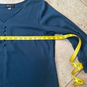 Blouse with sleeves that hit past elbow. Knit fabric on the back of top. 100% polyester in the front and the back is 95% Rayon and 5% spandex.