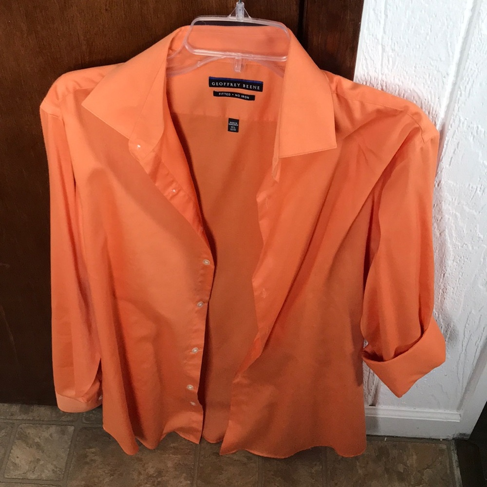 Happy the weather is finally starting to feel like spring? What better way to celebrate the weather than getting this cream orange button up that’s great for a night out with your friends or significant other? Get it while it lasts! Size medium. 32-33 fitted.
