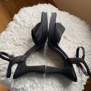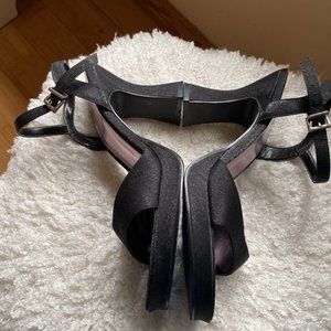 Great preowned condition Worn once 3” heel Fabric top Adjustable strap Dressy Pet and smoke free home