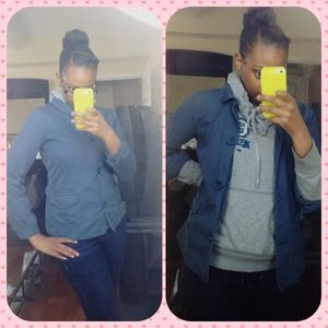 Khaki material spring coat. Color: ash blue. Size: medium. Fun coat to pair with a basic outfit. Missing belt... But looks better without one in my opinion!