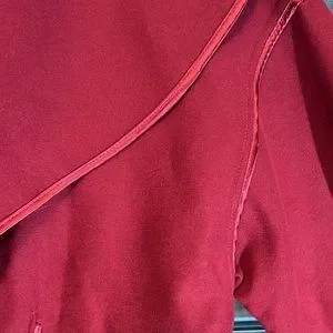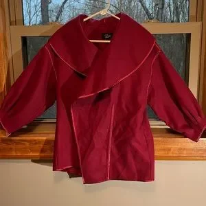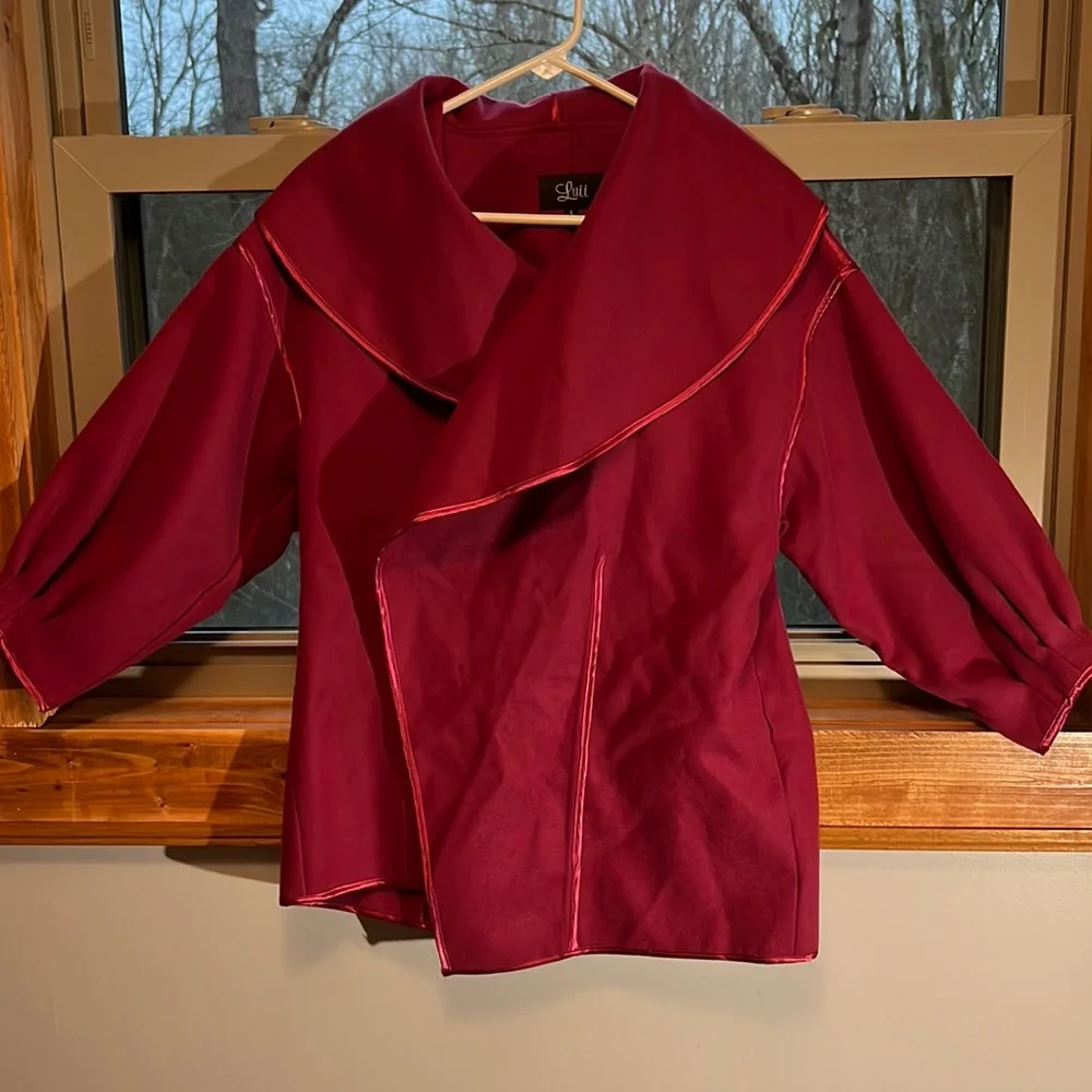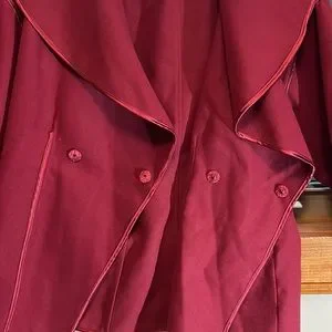 Wine colors coat with bunches sleeves that make it three quarter length when wearing. No pockets. Trimmed with statin. Buttons across.
