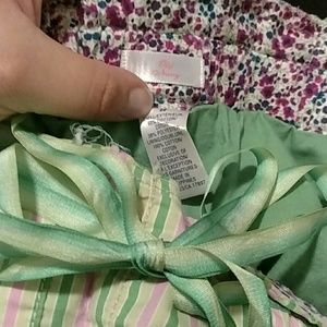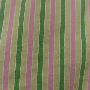 Pink green and white knee length skirt with an elastic waistband a dark green lining. There is a cute green tie in the front.