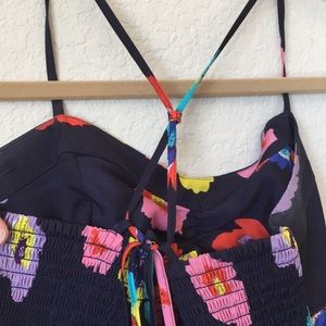 Fun floral dress. String straps tie in back so length is adjustable for perfect fit. Falls mid-thigh. Could be shorter for someone with longer legs though.
