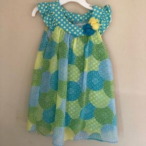 Beautiful spring dress with chiffon overlay and flower accent.
