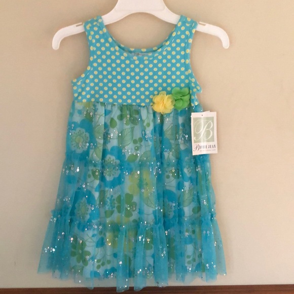 Beautiful spring dress with chiffon overlay and flower accent.