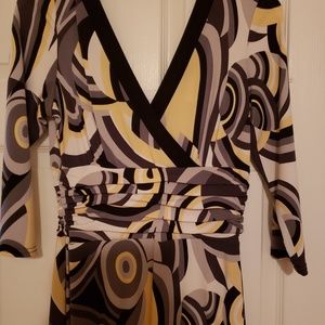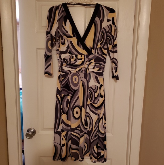 Fabulous fitting spring dress with runched area slightly above waist that adds a slimming effect. Although it looks backless, you are still able to wear your regular bra with it. Flowing material. Perfect as an Easter Dress or as an alternative to your standard little black dress.