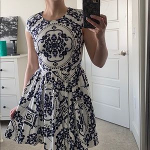 Lavender and black pattern skater dress. Cap sleeves. Cotton and spandex. Zip closure in back. Size XS