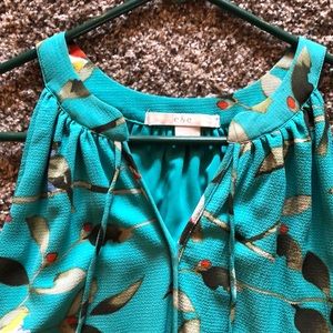 Green/blue floral dress with birds. Gathered neckline with v neckline and tassel detailing. Dress falls just past my knees (I’m 5’6”) Feel free to bundle with other items!