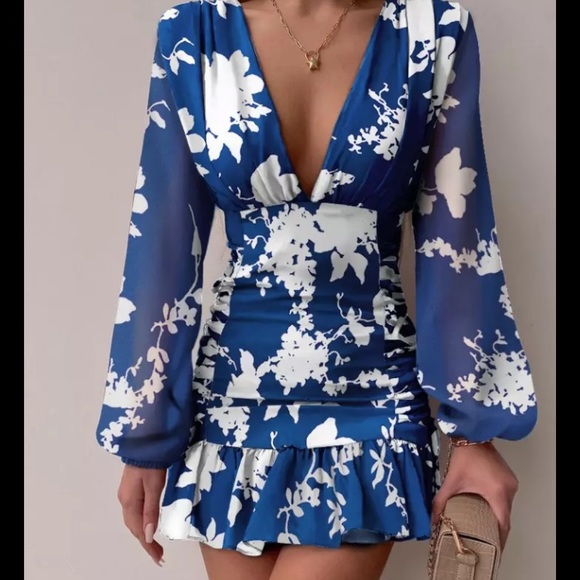 Casual Spring New Long Lantern Sleeve Short Dress 2022 Elegant Printed Mini Dress Women Sexy Deep V-Neck Ruffle A-Line Dresses