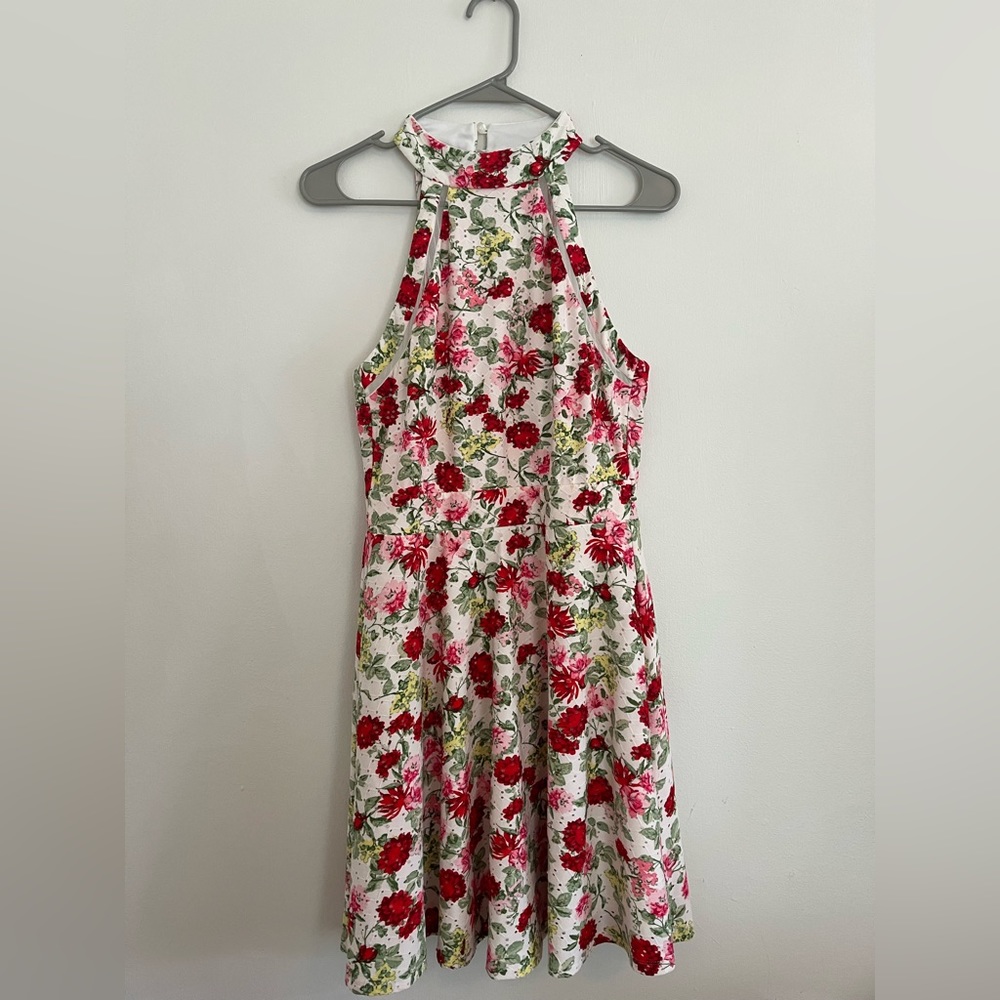 Light weight white dress with pink and red flowers. Halter top neck with detailed straps in the back. Barely worn and in great condition. From the brand teezeme. Size 9/10.