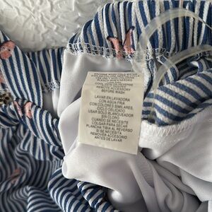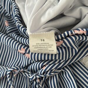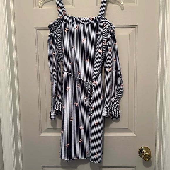 Cute navy and white striped with tiny butterfly detail, cold-shoulder lined dress with off the shoulder bell ruffled hem sleeves, tie belt, stretch elastic top. 28” length, 19” armpit to armpit, sleeve length 19” cute with or without belt. Excellent condition, worn once.