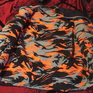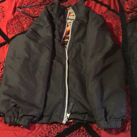 Thin jacket no hood. There is a small year along the bottom from use. No stains. Tag has worn off, I’m guessing size L