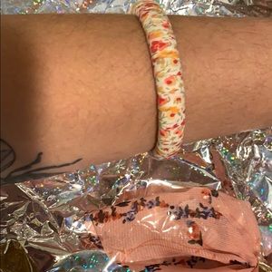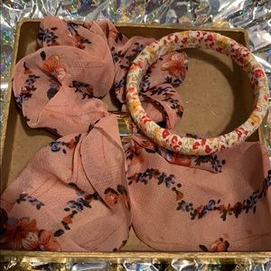 Pink with floral pattern scrunchy and floral cloth pattern bracelet bundle.