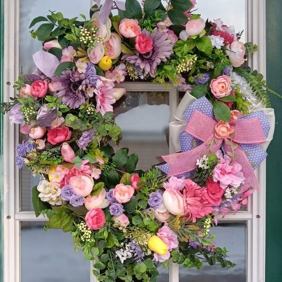 Spring grapevine wreath filled with Spring colored flowers and a mixture of greenery 22 inches long