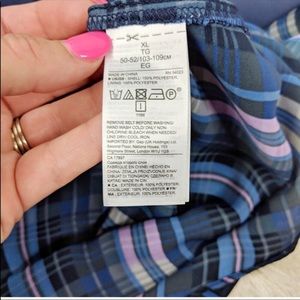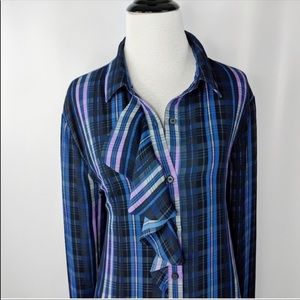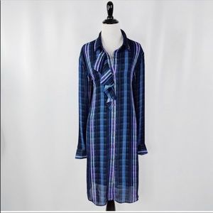 Beautiful blue plaid with subtle lavender, black and white stripes sets this shirt dress apart. Easily moves day to night. Button front. Fully lined excluding sleeves. Can be worn belted or loose. Style with blazer, flats, heelse, sandals, mules.