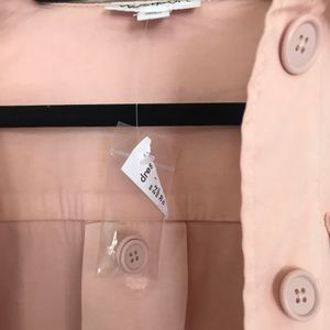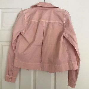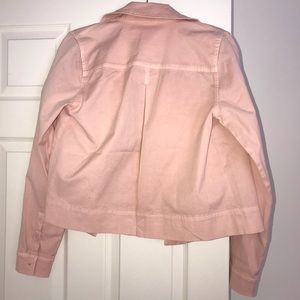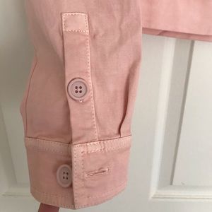 The tag is partially ripped but it is brand new, never been worn. It still has the vent sewn shut in the back of the jacket (pictured) it comes with an extra button and is super cute! I’d say the color is closest to a salmon pink/ coral? But a beautiful spring jacket nonetheless! Ask and questions and offers are always welcome!
