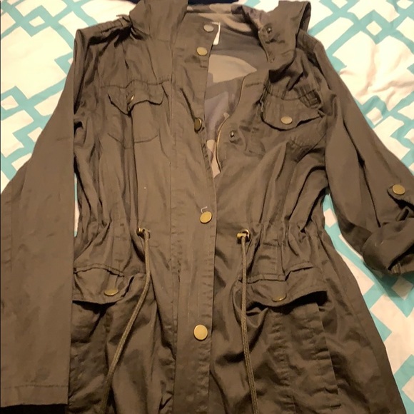 This beautiful olive green spring jacket is an amazing addition to your spring wardrobe. It has a singed waist to show off your curves. The sleeves can either be worn long or 3/4 sleeved. This jacket was only worn once.