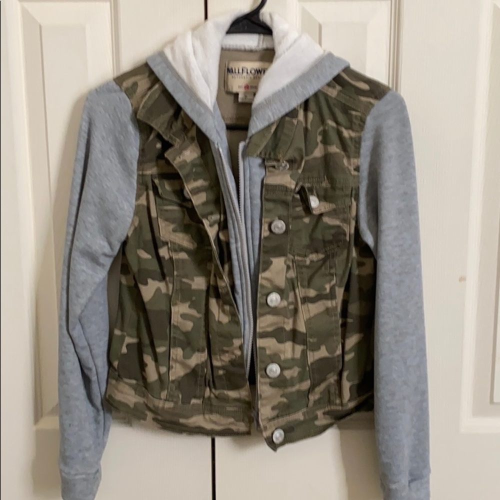 Green, army like pattern, with gray sleeves. A zipper and buttons!