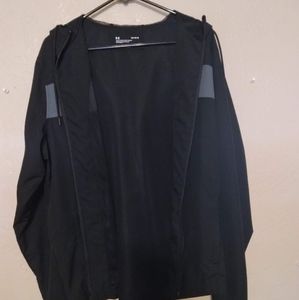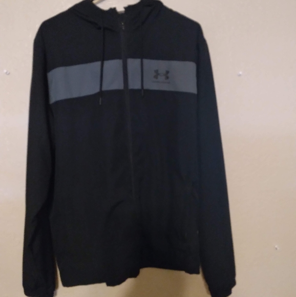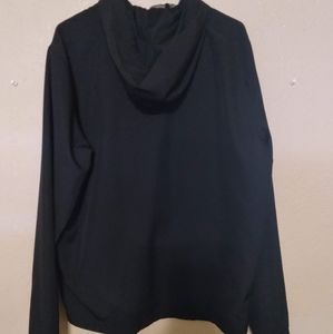 like brand new. to small for me. Side pockets have zippers. hood has strings. Very thin jacket, good for rain