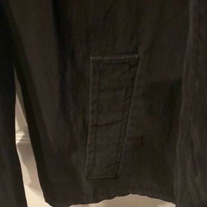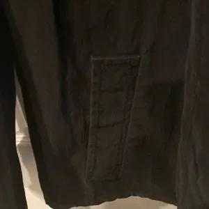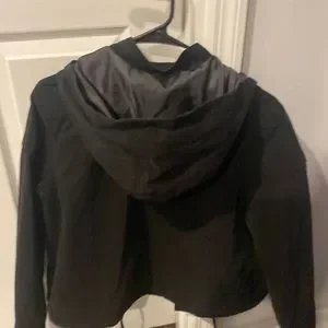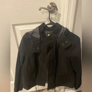 Hooded jacket cotton with 2 snaps on hood,2 pockets on sides by waist, button front clouser,polyester lining