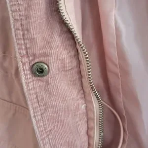 Cute coral/pink-ish spring jacket. Worn only 2-3 times. Color just didn't suit my complexion. Waist elastic to tighten if needed. Shoulder to shoulder is 18". Nape to bottom is 25". Measurements are approximate.
