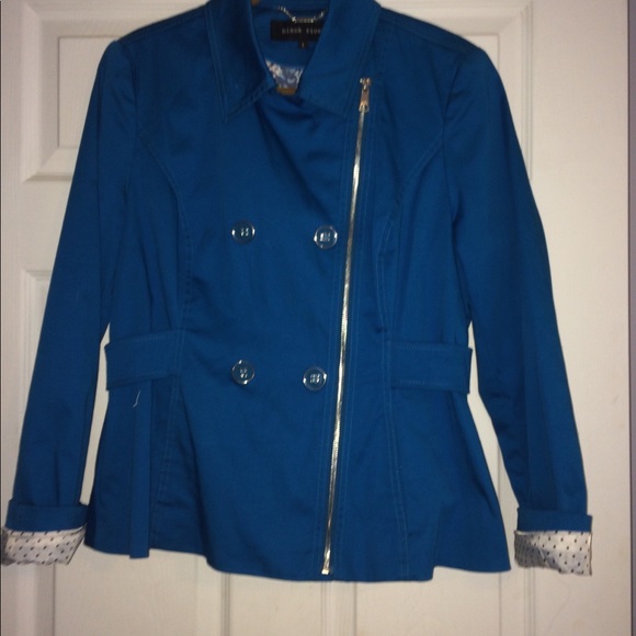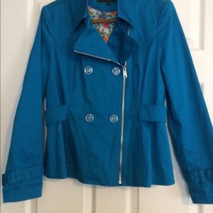 Stylish bright blue jacket just in time for spring! Lining is pretty spring flowers. Size medium-large. Looks like double breasted, but actually is a zipper front. Two flat front pockets to stash your phone or keys....Back placket fits your natural curves. Roll sleeves up to reveal cute polka dot pattern! Black Rivet brand , like new with out tags. Never worn. Rain repellent, too.