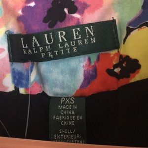 Pastel floral print spring jacket with buckle sash around the waist and beautiful black buttons. Ralph Lauren design and very stylish.