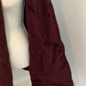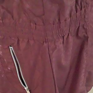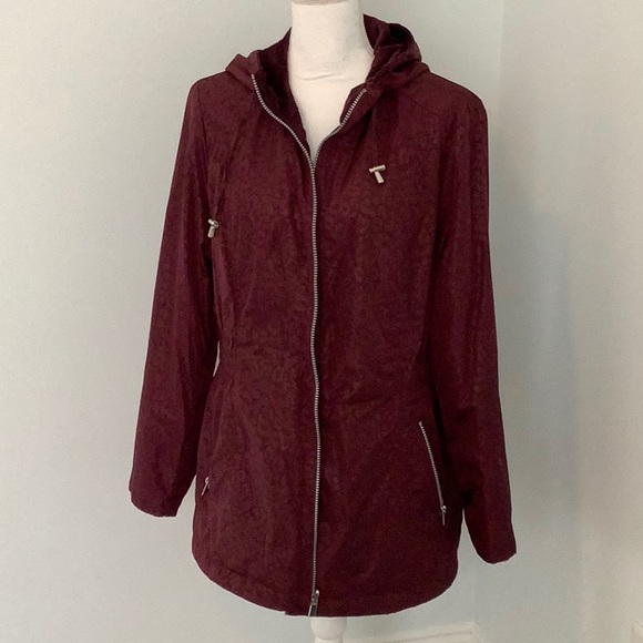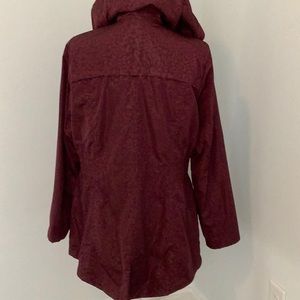 Deep cranberry warm rain jacket. Pockets that zip on the outside and hidden inside pockets. Waterproof and warm just in time for spring. Size large. Covers your bottom and has elastic waste for shaping.