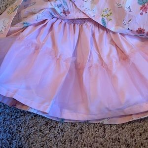 Bunny dress is Carter’s and other set is Little Me brand. Dress has a layer of tule for a little fluff. Lighting is just a little off. The dress is a more light pink color, almost like a baby pink. Daughter wore both for Easter.