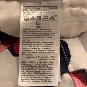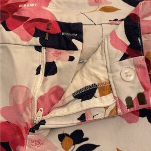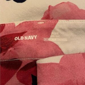 Capri length pants with different shades of pink flowers, navy blue flowers, and mustard colored leaves.