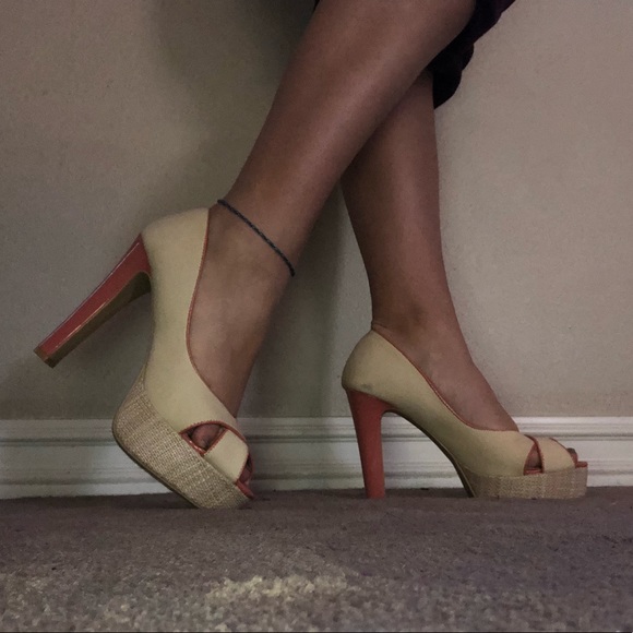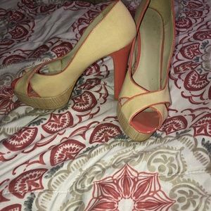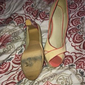 These are 5 inch cream and pink platform shoes. The thick heel is so supportive and makes the shoe comfortable! This is perfect for any spring casual event such as bridal showers, baby showers, weddings, or more! Only worn once!