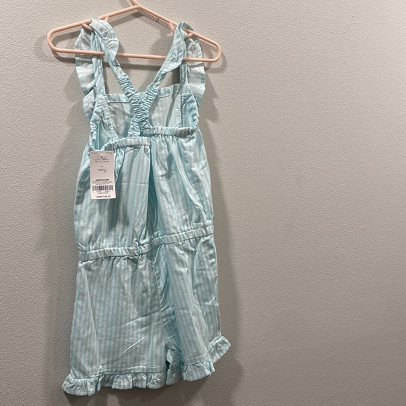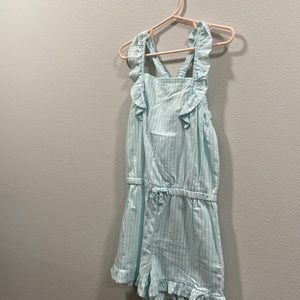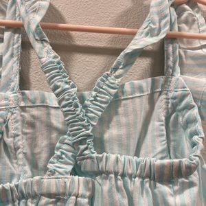 Cute stripe romper with ruffles and a cross back.