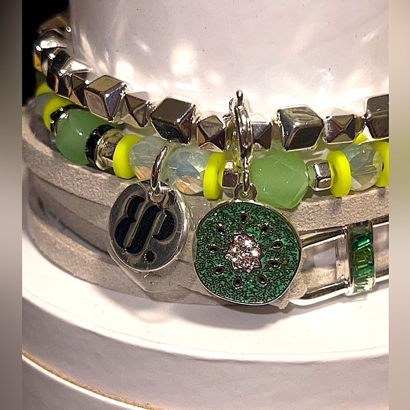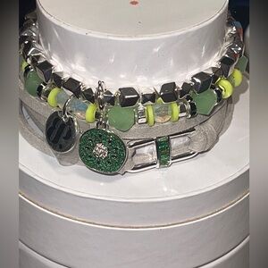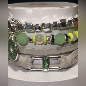 Kiwi love, a stunning 3 piece set of our spring stacks. The gray bracelet is a leather band, and the other two with beads and cubic zirconia. Start your obsession today 😍