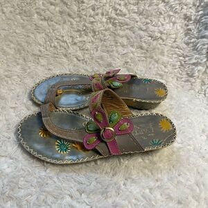 L'ARTISTE SANTORINI TOE RING MULTI COLOR SLIDE WEDGE SANDALS EUR SZ38 pre owned in good used condition see all pictures any questions please message. A11