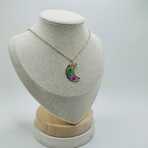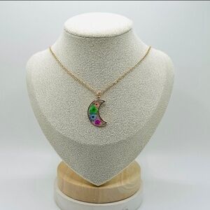 This crescent moon shaped pendant features a delicate colorful floral pattern crafted from glass