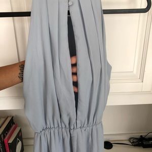 Photos discolor the dress, however it is a blue with a tint of grey. Open back