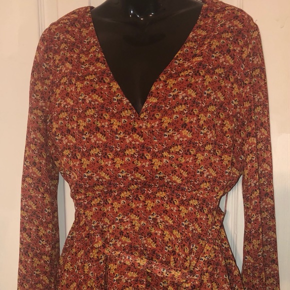 Cute and fun dress. Fell right above the knee. Has a matching belt and zipper in the back. Large but fits closer to a medium.
