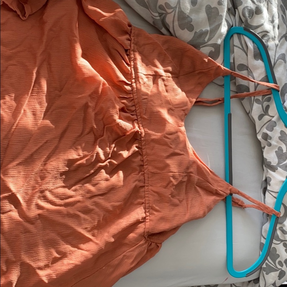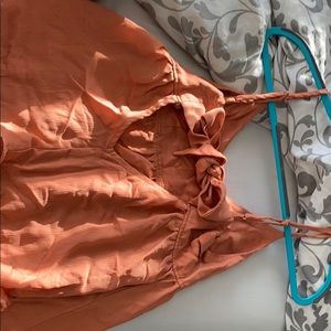 Light orange tank with open back plus tie. Fits like a babydoll top (little cropped). Adjustable spaghetti straps and V-neckline. Worn twice and has no rips or tears.