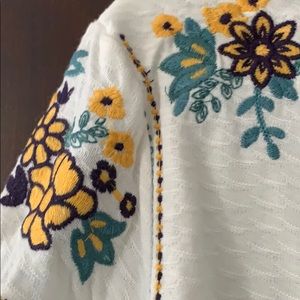On trend cute spring top, white with floral embroidery on the shoulders and really cute details on the sleeves.Excellent condition purchased from Francescas only worn one time.