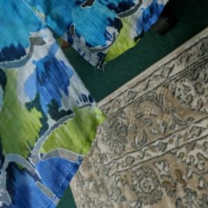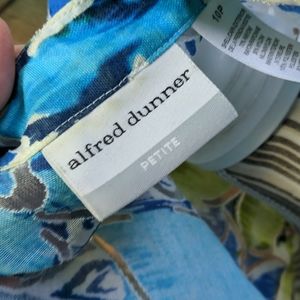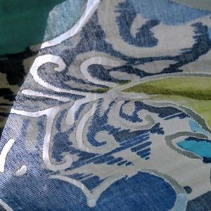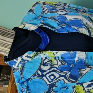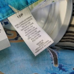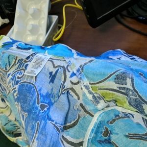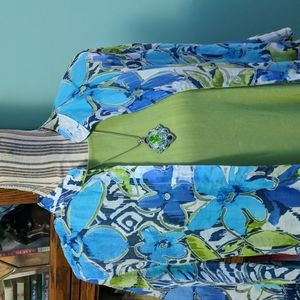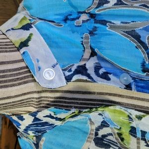 Fold back 3/4 cuffs, button down shirt/jacket in shades of lime, turquoise and deep blue. hip length, needs a tank or chemise under it, as the fabric is sheer in spots. I tried to show that in the photos. 100 percent Polyester, feels like linen, light and airy. great casual work attire or dressy depending on how you style it. no stains, snags or signs of use. from a smoke free home where we care for nice things so they stay nice. topper only, nothing else included.
