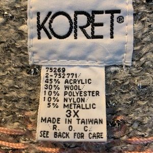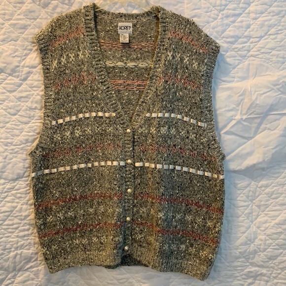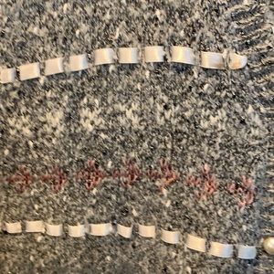 29 inches from neck to hem, approximately 50 inch chest, 5 buttons down the front, gray with pink and soft gray ribbon accent