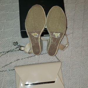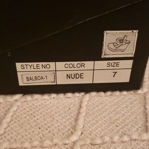 Sweet nude wedges with ankle strap, scallop edge details, and braided border. Faux suede.