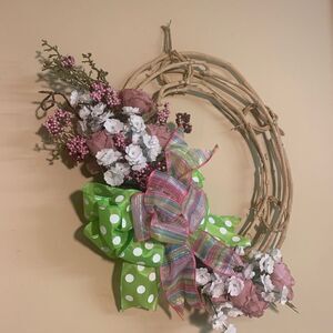 Spring wreath with pink, white and green. Bow has two ribbons. Sweet decor