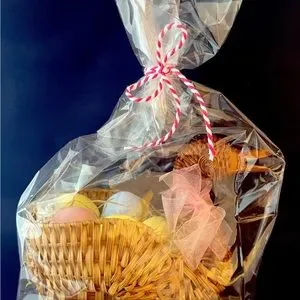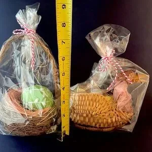 Two adorable baskets. One traditionally shaped with a lovely paper maché egg. The other basket is shaped like chick/bird/duck and filled with smaller, paper maché eggs. Individually wrapped and ready for gifting or your own decor. Happy spring!