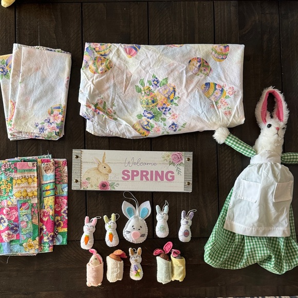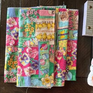 4 darker pastel cloth napkins that do not match the table cloth but they are lovely. They have floral, egg, and chick patterns.