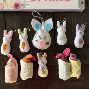 6 cloth bunny ornaments. 1 larger bunny head and 5 small whole bunnies.