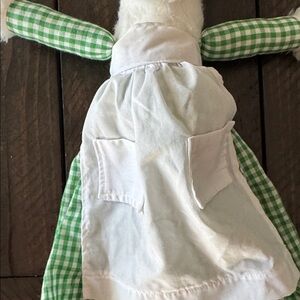 1 large white rabbit. The ears are connected to maybe hang on a door handle? The back of the dress has an opening, maybe a place to store plastic bags? I'm not sure. This rabbit looks older.