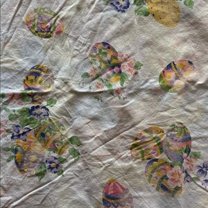 1 vintage looking round table cloth. 59" across. White with decorated eggs pattern. There are light pastel patterns in the background. I thought they were stains at first but it's a pattern.