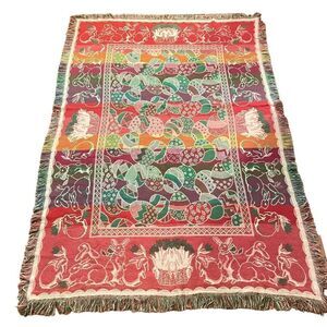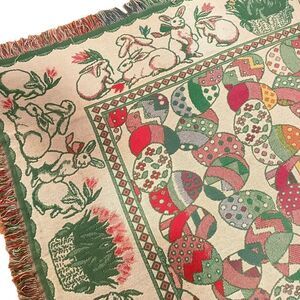Easter themed fringe blanket with an Easter egg and bunny rabbit print design. Soft, Medium weight.