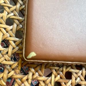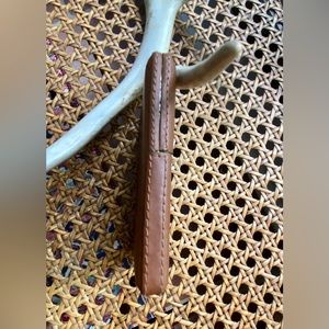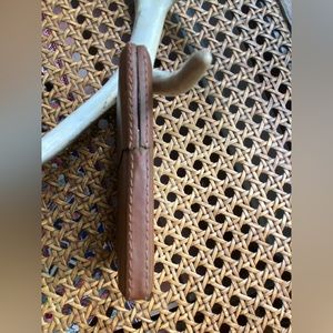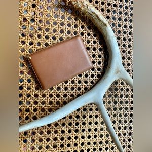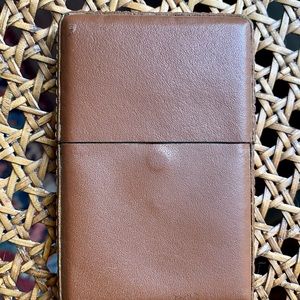 This brown spring-loaded credit card wallet has great style and function. One flaw on the backside (see pictures). Measures a bit short of 4 inches X 2-1/2 inches. Measures approximately 3/8 inches in depth. Easily accommodates six credit cards/id.